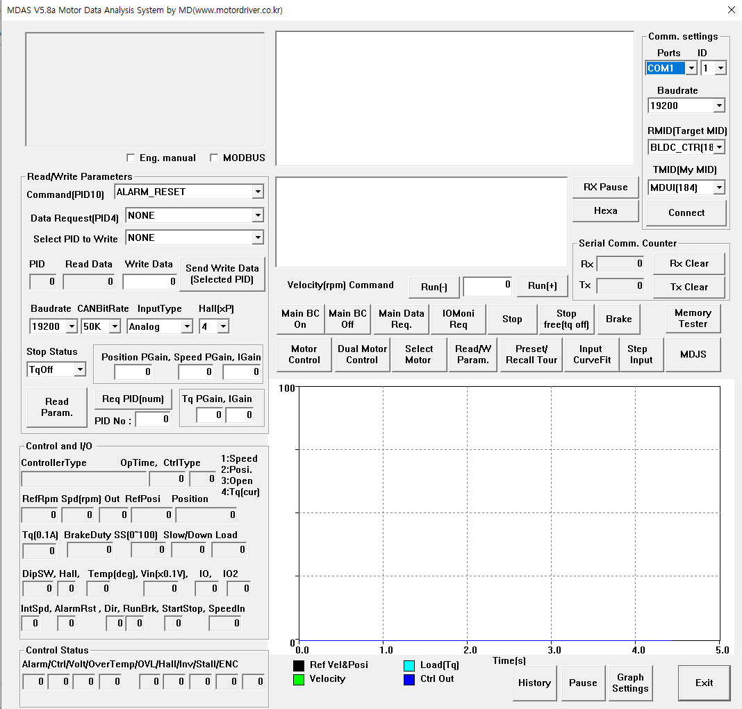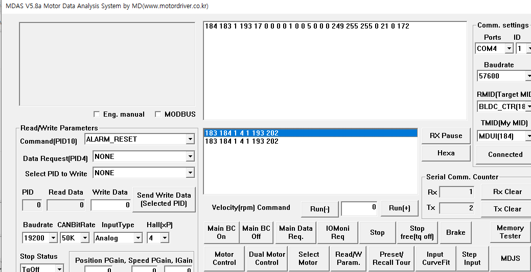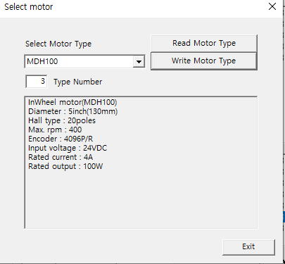 - 우측 중간의 메뉴들 중 Select Motor 선택 후 MDH100선택, Write Motor Type 클릭