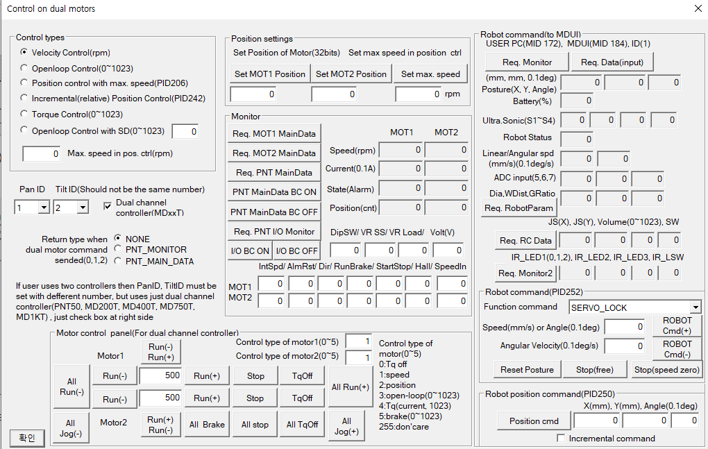 - Dual Motor Control창을 열고 Motor control panel에서 RPM을 입력하고 회전 방향을 선택하여 구동 (Run+, -)