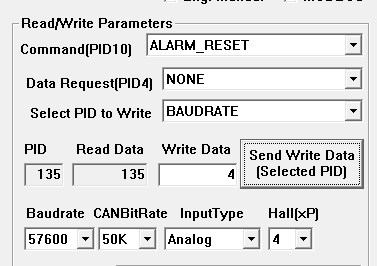 - Baudrate를 57600으로 설정하고 Send Write Data(Selected PID) 클릭