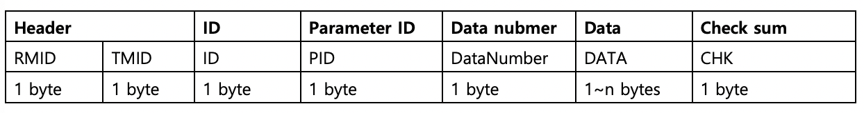 - RMID(Receiving Machine ID) : 패킷의 첫번째 인식바이트(183, 모터제어기)