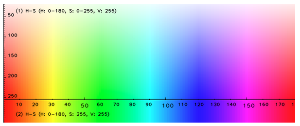 - 위 색상표에서 x축이 H, y축이 S, S = 255, V=255에