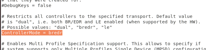- Bluetooth 설정 파일을 연 후 51번줄의 주석을 해제한 후 ControllerMode를 bredr로 변경