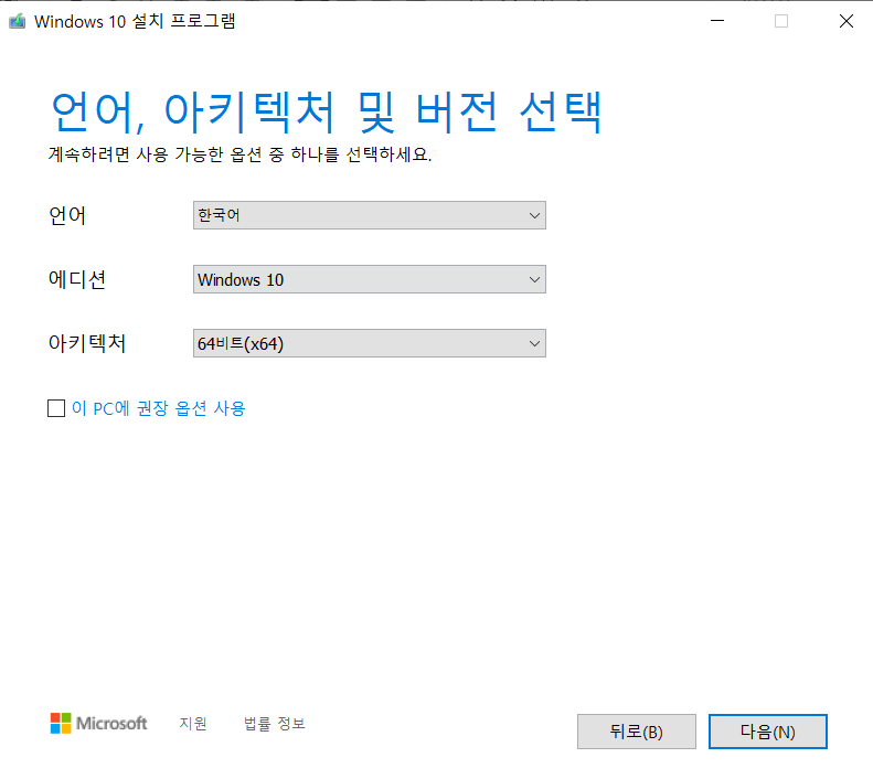 - '이 PC에 권장 옵션 사용' 선택 시 현재 부팅 USB를 제작하고있는 PC를 기준으로 설정하므로 해제