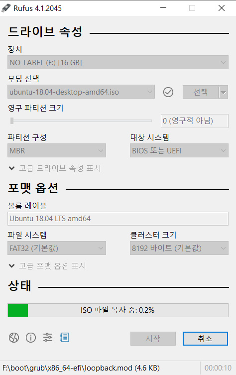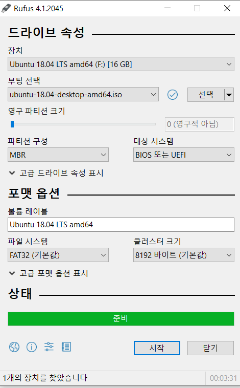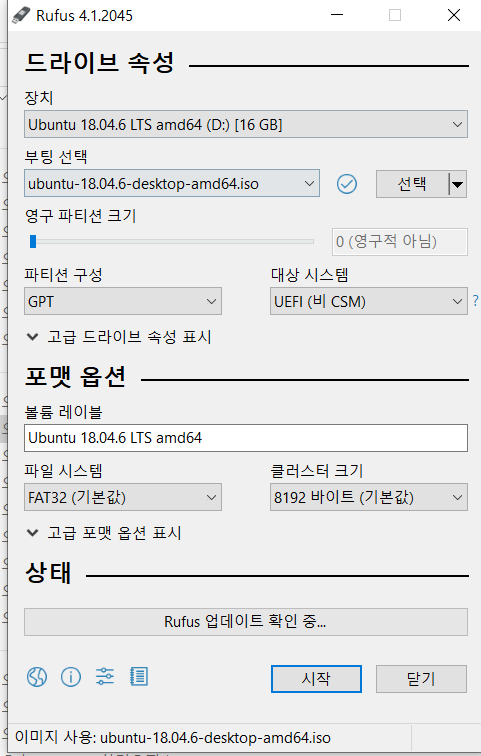 - 설치 완료 후 rufus를 통해 USB에 image file을 FLASH