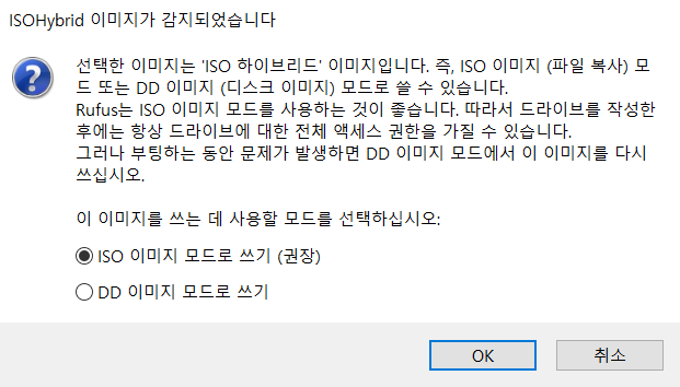 - ISO 이미지 모드로 쓰기 선택