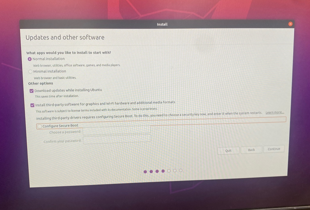 - Updates and other software 창에서 Normal Installation만 선택