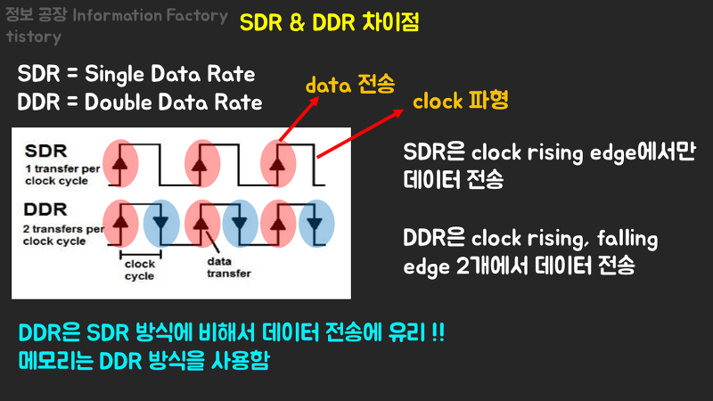 - SDR(Signle Data Rate)은 Clock의 Rising Edge 에서만 데이터를 전송하는 반면 DDR은 Rising, Falling Edge 2개에서 데이터를 전송하여 SDR에 비해 2배 더 많은 데이터를 보낼 수 있어 Double Data Rate라 불린다. 일반적으로 메모리는 DDR 방식을 사용한다