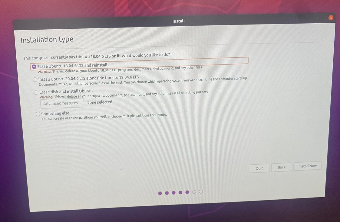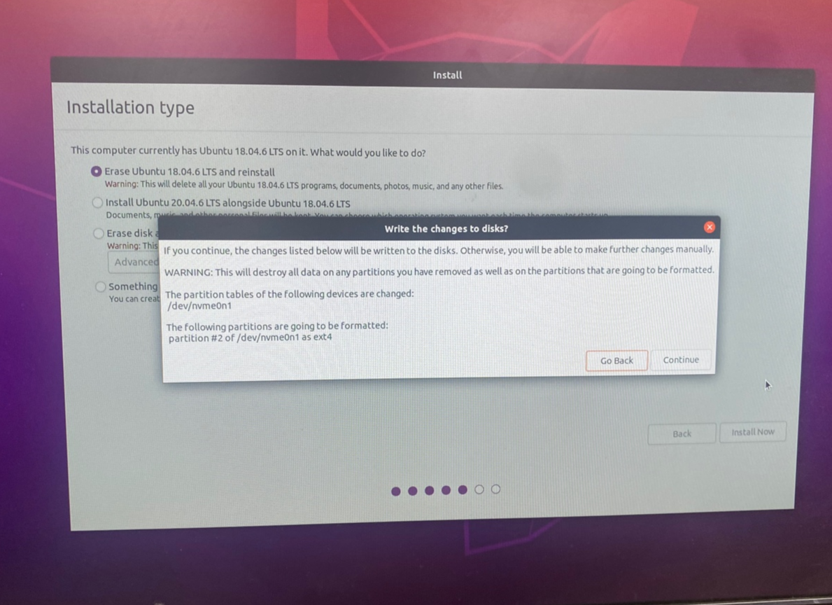 - 위의 경우 기존에 18.04가 설치되어있어 이를 지우고 20.04만을 사용하기 위해 Erase Ubuntu... 선택
