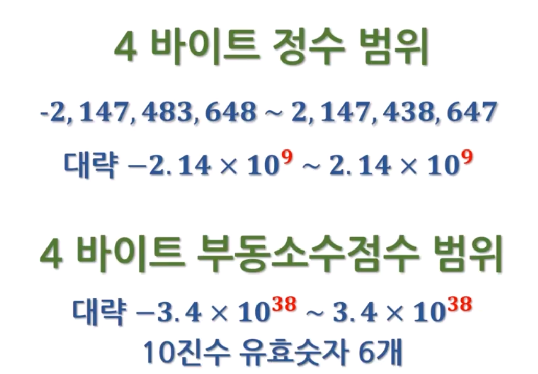 - 부동소수점을 사용하면 표현 범위가 훨씬 넓게 늘어남. 다만 메모리를 쪼개쓰므로 불리한 부분도 있음.