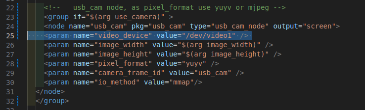 - Launch File (~/catkin_ws/src/aruco_detector_ocv/launch/detector.launch) 확인 결과 "video_device" Parameter의 값이 "/dev/video1" 로 설정되어 있었음