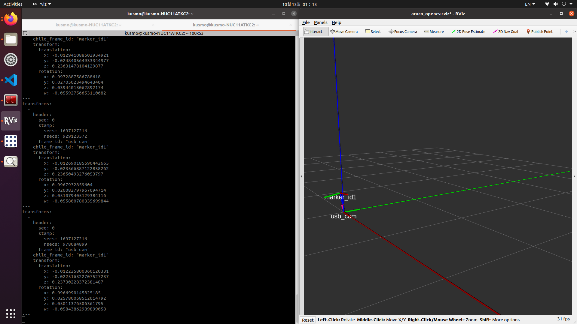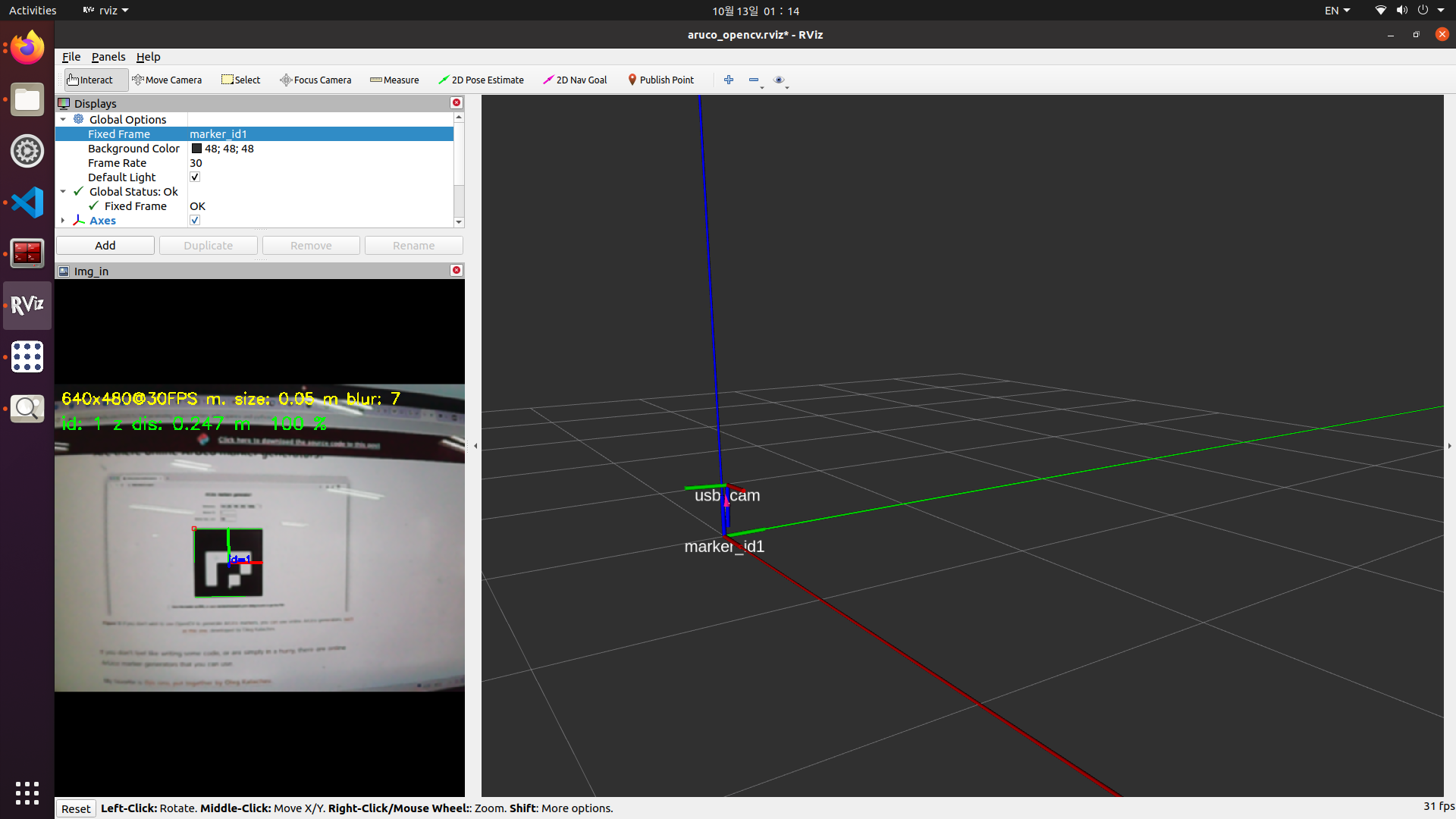 - 이후 USB Camera와 Aruco Marker의 TF 방향 확인