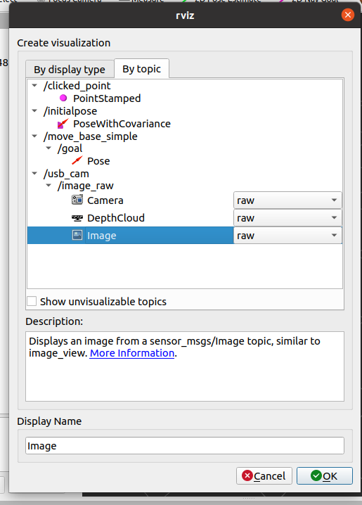 - 실행 후 Rviz 창에서 Add -> By topic -> /usb_cam 선택 -> /image_raw 중 image(raw) 을 선택하여 카메라 영상 확인