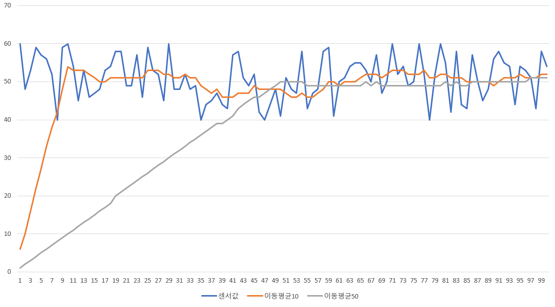 - 1초 간격으로 총 100개의 샘플에 Moving Average Filter를 적용하는 코드