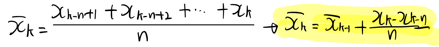 - $ \tilde{x}_{k} = \frac{x_{k-n+1} + x_{k-n+2} ... + x_{k}}{n} = \tilde{x}_{k-1} + \frac{x_{k}-x_{k-n}}{n} $