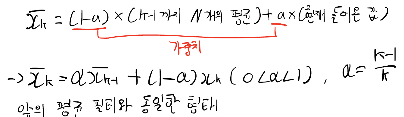 - 위의 Moving Average Filter에서 과거의 값들보다 현재에 가까운 값에 가중치를 더 크게 부여하는 방식