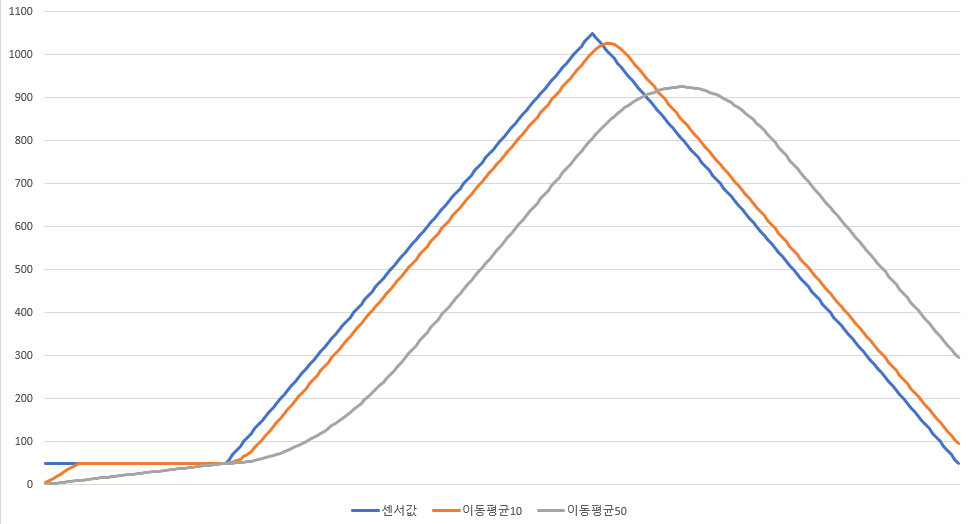 - 측정하려는 값이 위처럼 일정하지 않고, 지속적으로 변하면 Average Filter로는 대상의 동적인 움직임을 따라가지 못함