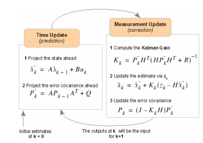 전 Time Step에서의 결과값인 추정값과 오차 공분산 값을 통해 현재 Time Step에서의 추정값과 오차 공분산 예측