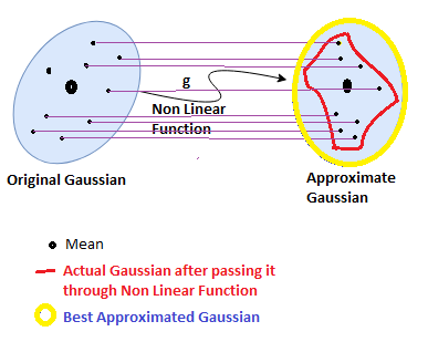 - 계산된 Sigma Point들을 Non Linear Function에 Input으로 넣고 Output을 통해 Gaussian Distribution 추정