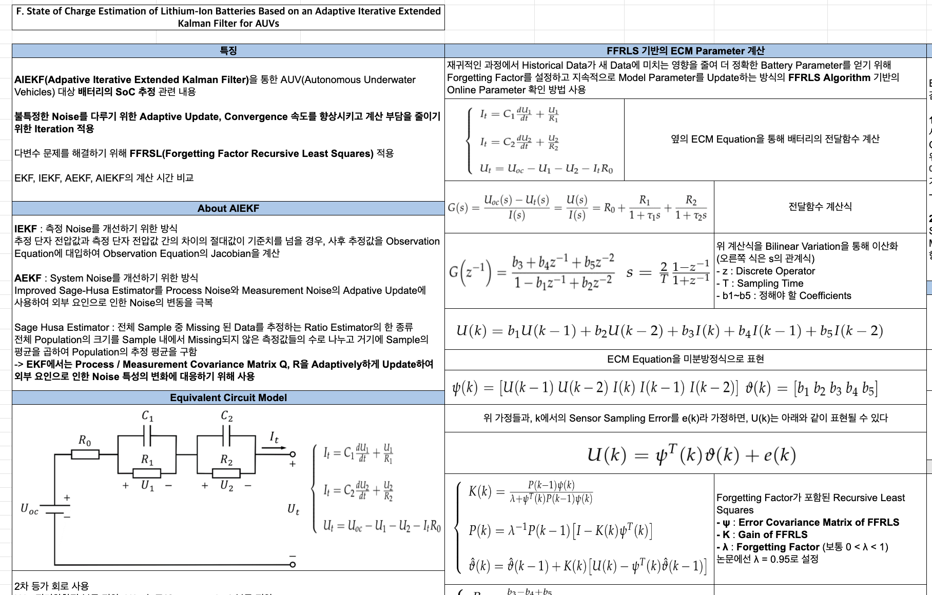 - AIEKF(Adaptive Iterative Extended Kalman Filter) 활용 LFP Cell SoC 추정 논문 1건 분석