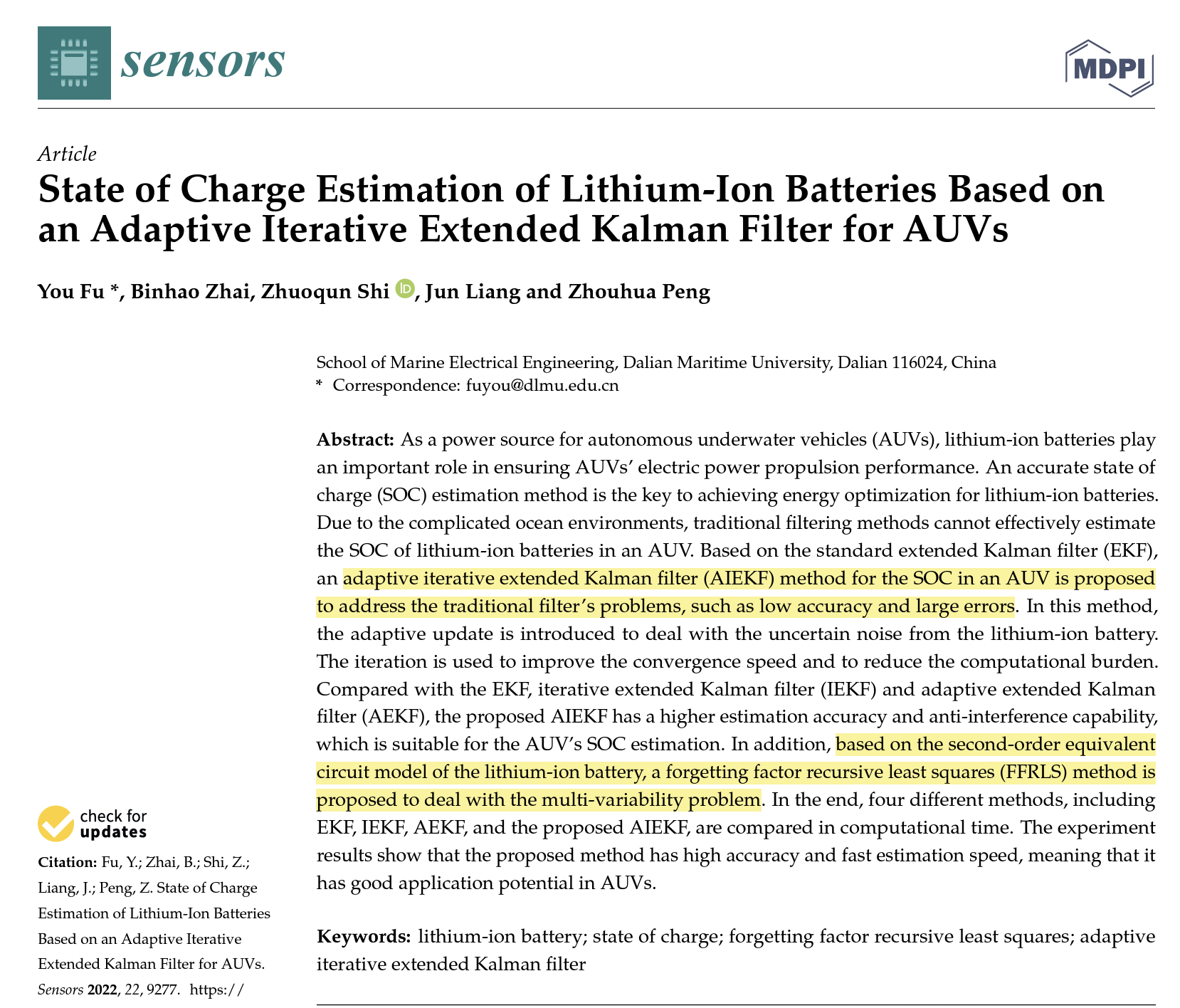 - You Fu, Binhao Zhai, Zhuoqun Shi, Jun Liang, Zhouhua Peng, "State of Charge Estimation of Lithium-Ion Batteries Based on an Adaptive Iterative Extended Kalman Filter for AUVs", Sensors(2022)