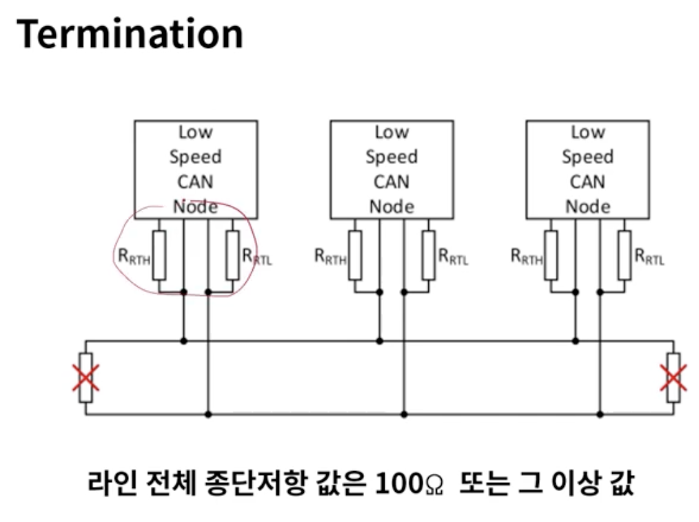 - 맨 끝단에서는 처리 X : ISO11898-2 사양에서는 종단저항 처리에 대한 내용이 따로 기술되어있진 않음
