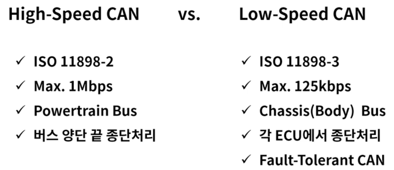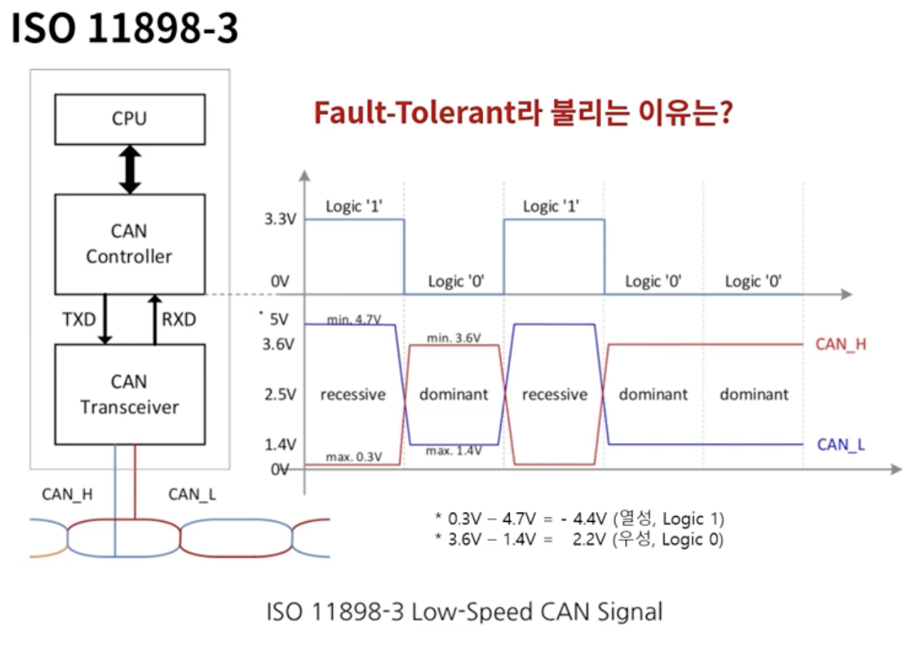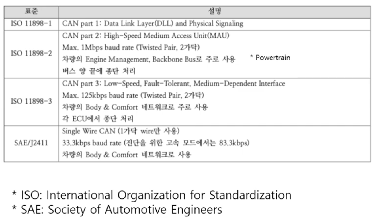- ISO11898-3 : Low Speed CAN (최대 125kbps), 즉 차량 바디, 샤시 등의 ECU를 연결하는 통신 방식 관련