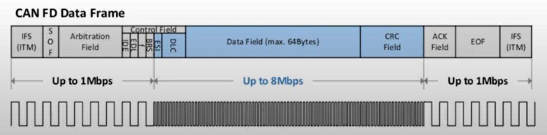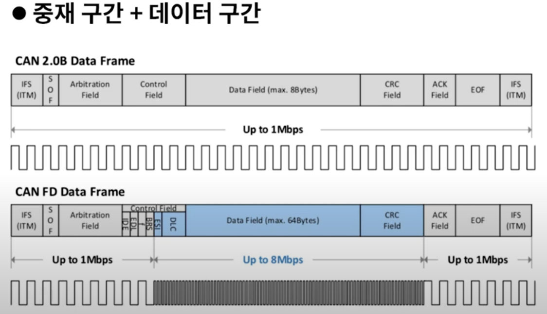 - CAN FD의 경우 Data 구간에서는 8배 빠른 Clock으로 보낼 수 있도록 함 : 최대 64 byte까지 전송 가능