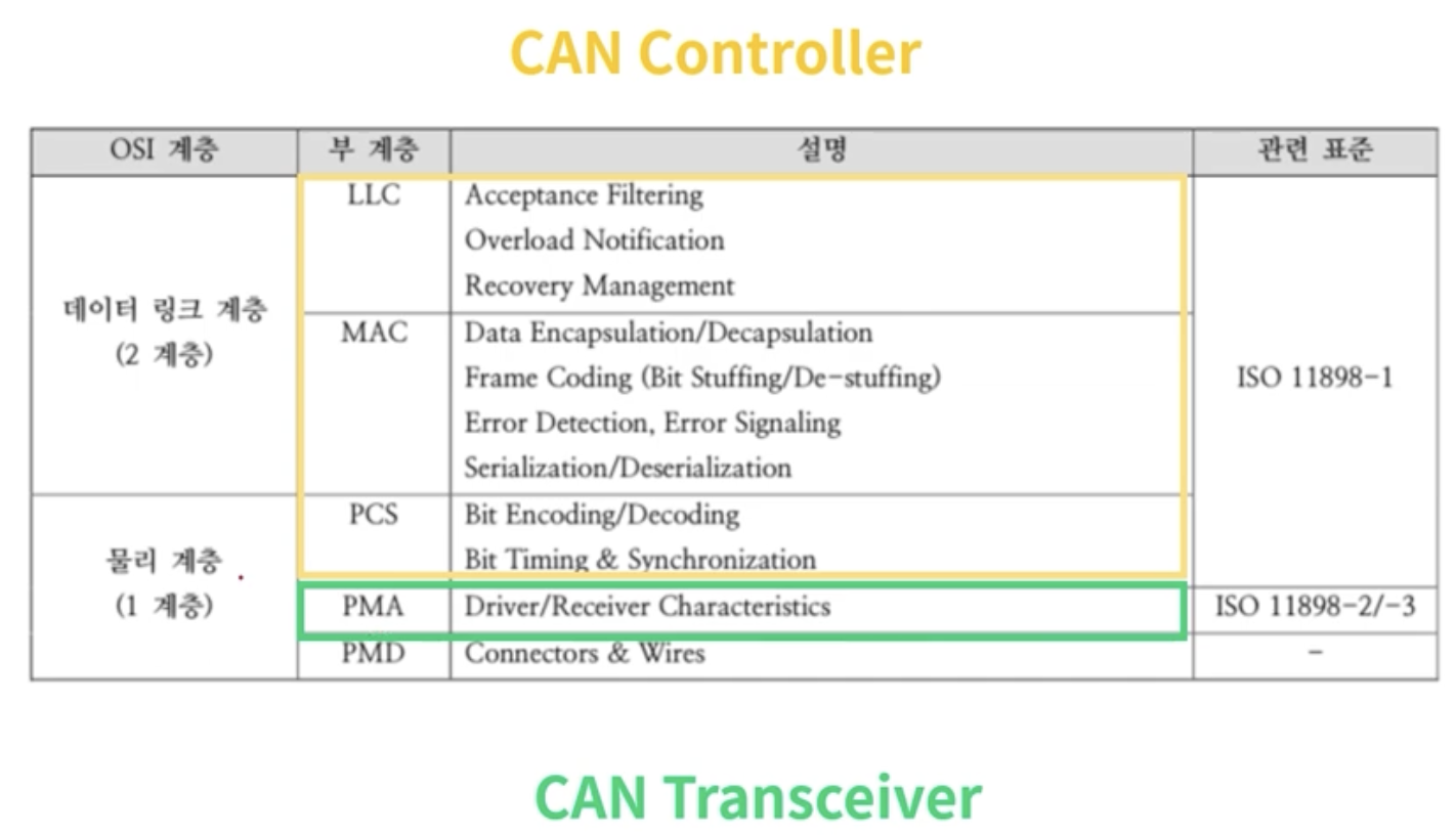 CAN Controller : Protocol의 Data Link Layer - CAN Frame, ID 확인 등 관리 - CAN Transciver : Protocol의 Physical Layer