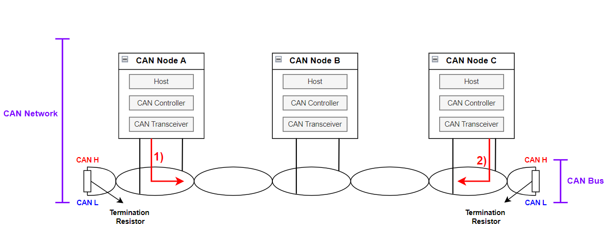 - 실제 물리적으로 CAN 구현 시 Host / CAN Controller, CAN Transceiver로 구성