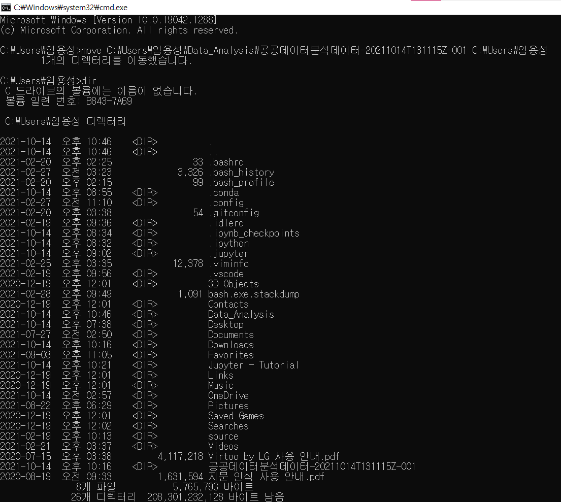 - 강의 영상에서는 %mv로 파일을 이동시키고 %ls로 현재 위치에 있는 파일들을 나타냈으나 위 명령어들은 Unix OS 계열의 명령어로, Windows에선 지원을 하지 않기 때문에 다른 명령어를 사용해봤다.