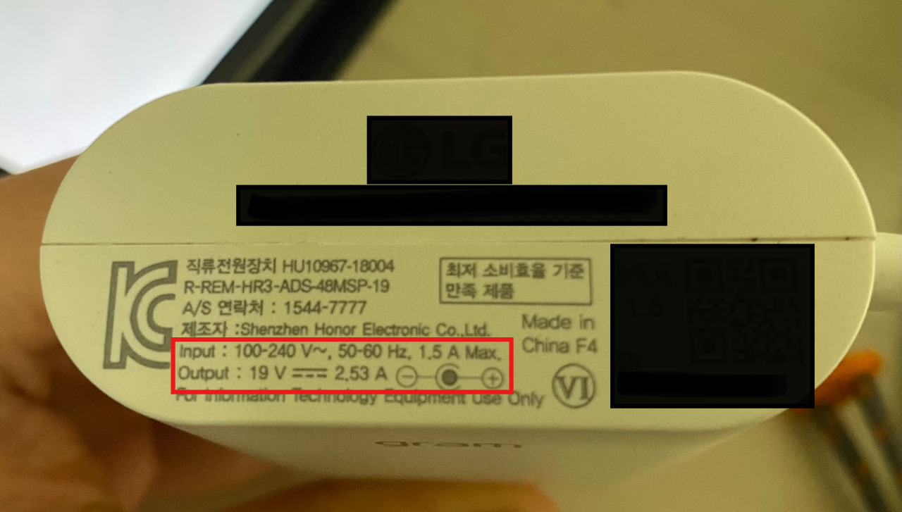 - 19V의 직류 전압 (선 표시는 DC라는 뜻) 출력