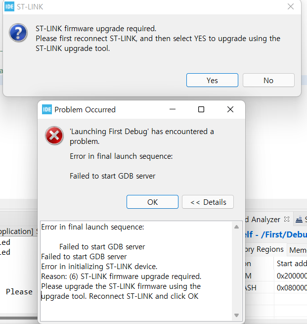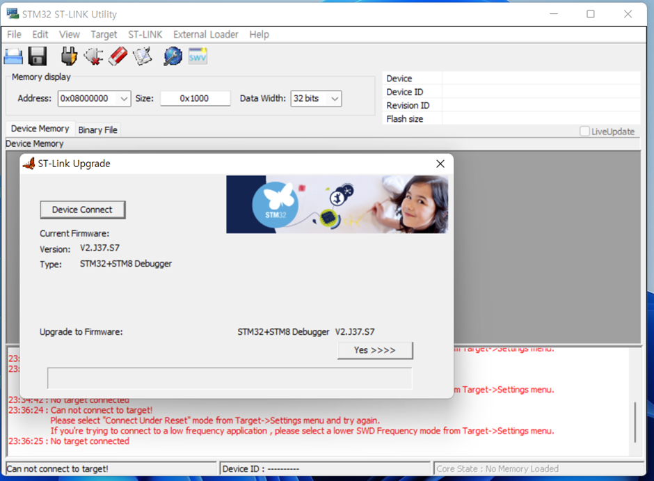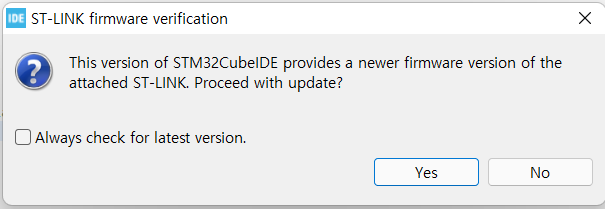 ST-LINK Utility 실행 - ST-Link -> Firmware update 선택 -> USB 다시 연결 후 Device Connect, yes를 눌러 firmware update 진행