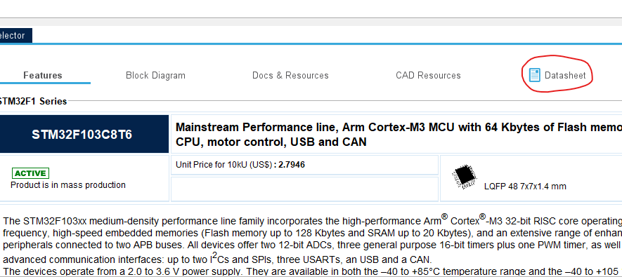 - 위의 Datasheet창을 선택하면 해당 칩의 최신 datasheet가 나옴