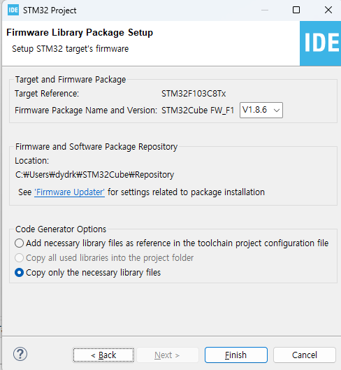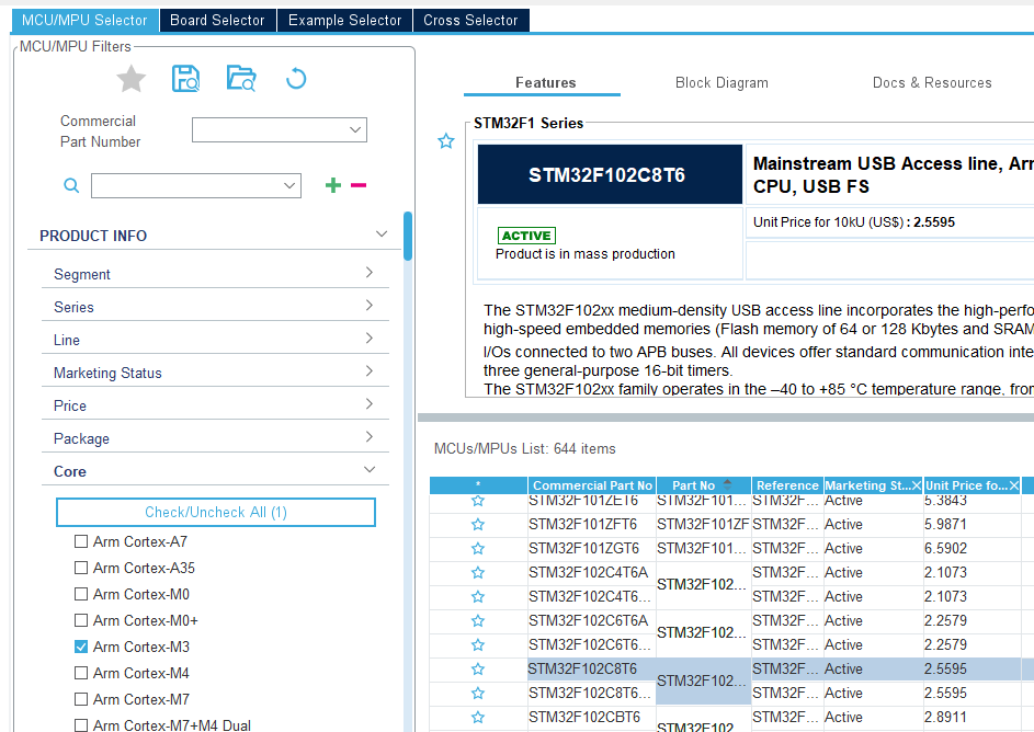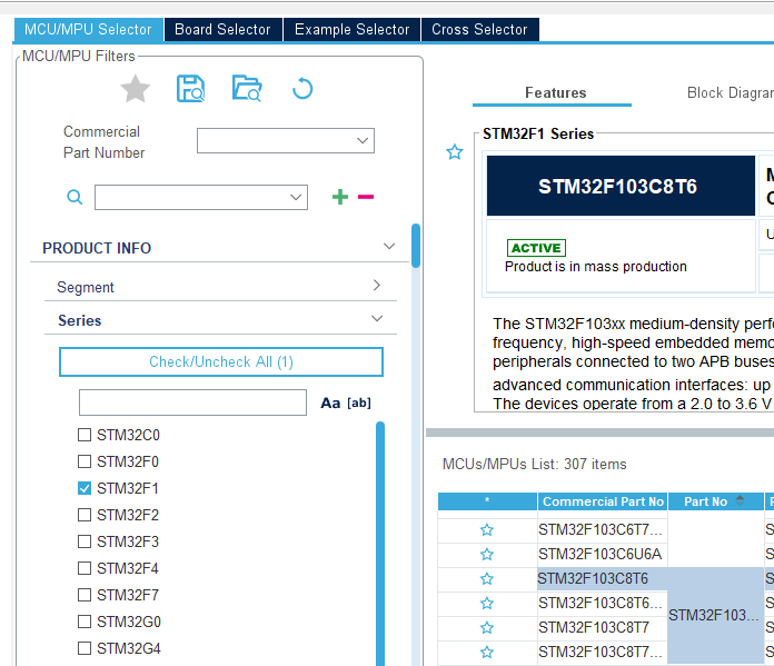 - STM32 Project 창에서 제품 찾기 : Series에서 STM32F1 선택 -> 그 중에서 STM32F103C8T6선택