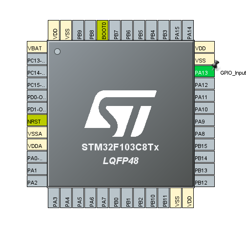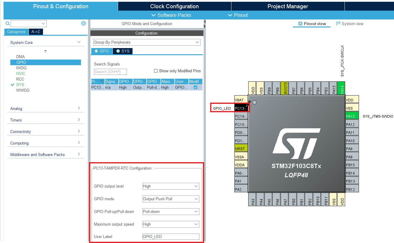 - 프로젝트를 생성하고 칩 설정 : STM32F103C8T6