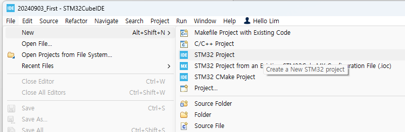 - File -> New -> STM32 Project 선택 (좀 오래 기다려야 함)