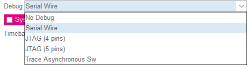 - Debug는 Serial Wire, Timebase Source는 SysTick으로 설정 (Debug interface 종류)