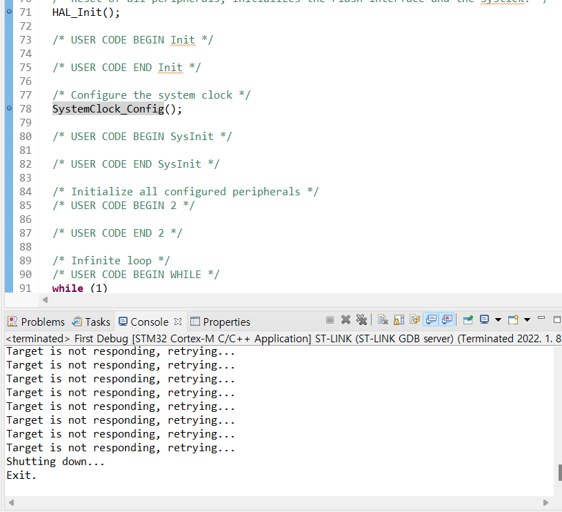 - Debugger Update 완료 후 SystemClock_cinfig();에 breakpoint를 찍고 debug 실행
