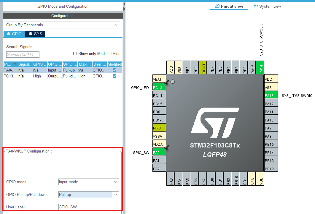 - PA0을 GPIO input으로 설정하고 위와 같이 설정 후 저장해서 코드 생성