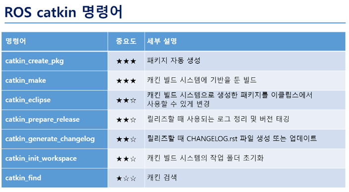 - catkin은 ROS 코드를 빌드하고 구성할 때 사용하는 build system으로써, catkin 명령어를 통해 build를 하거나 의존성 관계 확인